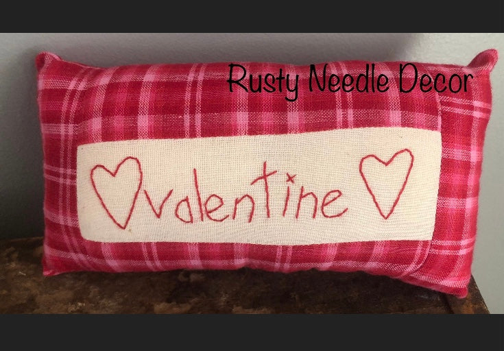 This little hand embroidered pillow measures 8 inches long and 4 inches tall. It features the word Valentine and a heart at each end all hand embroidered in red. It is bordered and backed with a red and pink plaid fabric.
